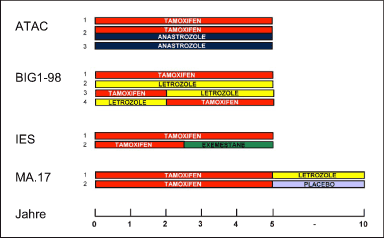 - Der optimale Einsatz der AI in der adjuvanten Situation ist nicht bekannt: es fehlen derzeit die Daten, um zu entscheiden, ob «up-front» ein AI gegeben werden soll (wie in ATAC oder BIG-1-98), oder besser nach 2-3 Jahren Tamoxifen (wie in IES oder Arm C von BIG-1-98) oder vor Tamoxifen (wie in Arm D von BIG-1-98) oder nach 5 Jahren Tamoxifen (wie in MA .17). Zudem ist die optimale Dauer von L nach 5 Jahren Tamoxifentherapie nicht bekannt.