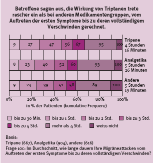 Praktische Erfahrung und verschiedene Studien belegen aber die alte Erfahrung, dass eine Migräneattacke unverzüglich nach Beginn und mit ausreichender Dosierung behandelt werden soll. Diese, der verzögerten Behandlung deutlich überlegene Strategie zeigt nicht nur Vorteile gegenüber verkürztem Leiden, sondern auch pharmakoökonomische Vorteile. Die Attackenbehandlung kommt insgesamt billiger zu stehen. Im Umgang mit Attackenmedikamenten zeigte die Umfrage folgendes: Triptane wirken schneller als die Klasse der Analgetika (Abbildung 2). Die Attackenlänge und Anwendung von Triptanen war kürzer als unter Analgetika (4 Stunden 16 Minuten versus 5 Stunden 26 Minuten).