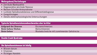 Nur schon der eng gesteckte Rahmen des reinen Spinalkanales ergibt aufgrund der möglichen Ursachen bereits eine breite Palette von Möglichkeiten. Diese muss durch eine seriöse Anamnese- und Befunderhebung eingeschränkt werden. Üblicherweise können reine lumbale Spinalkanalstenosen, zervikale Myelopathien und auch eindeutige radikuläre Syndrome gut abgegrenzt werden. Schwierigkeiten bereiten oftmals die häufigen zervikobrachialen aber auch myofaszialen Nacken-Schulter-Armsyndrome einerseits und lumbospondylogenen aber auch zervikospondylogenen Syndrome andererseits. Diese können aber im Ausschlussverfahren meist gut herausgearbeitet werden.