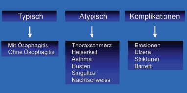 Das klinische Spektrum der Refluxkrankheit lässt sich prinzipiell in 3 verschiedene Kategorien einteilen: die typischen Symptome, die atypischen Symptome sowie die Komplikationen: