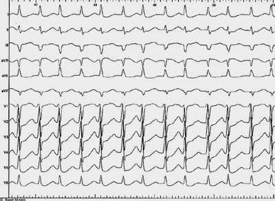 Die persistierende Deltawelle bei maximaler Belastung spricht für eine akzessorische Bahn mit kurzer Refraktärzeit. Tritt zusätzlich Vorhofflimmern oder Vorhofflattern auf, so besteht die Gefahr einer schnellen Kammeraktivierung über die akzessorische Bahn mit Degeneration in Kammerflimmern. Deshalb erfolgte eine elektrophysiologische Untersuchung mit Nachweis der akzessorischen Bahn bei 14.00 Uhr im Mitralklappenannulus. Während der Untersuchung konnte eine Tachykardie ausgelöst werden: