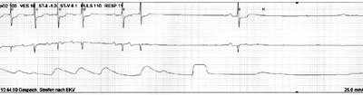 Mit einer hohen Dosis Betablocker in Kombination mit Digoxin gelingt es zwar, die AV-Überleitung so zu blockieren, dass die Ventrikel-Frequenz in Ruhe um 60/min beträgt. Sobald sich der Patient aber belastet, steigt die Ventrikel-Frequenz inadäquat an, so dass man sich zur Elektrokonversion (EKV) des Vorhofflatterns entscheidet. Vorgängig wird der Schrittmacher mit dem Programmiergerät überprüft (wobei sich normale Werte finden) und in die Betriebsart V00 umprogrammiert. Anschliessend wird in einer Kurznarkose die EKV mit 100 J durchgeführt. Dann wird ein Rhythmusstreifen geschrieben: