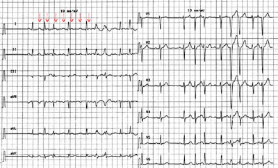 Das initiale EKG ist zwar arrhythmisch, es zeigt sich allerdings bei genauerem Hinsehen eine regelmässige Vorhofsaktion mit einer atrialen Frequenz von 200/min (EKG 3).
