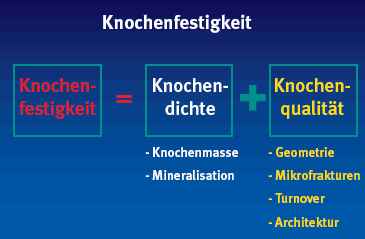 Wie Univ. Doz. Dr. Astrid Fahrleitner-Pammer, von der Klin. Abt. für Endokrinologie & Nuklearmedizin der Med. Universität Graz (Österreich) ausführte, steht bei der Osteoporose-Therapie bisweilen nur der Aufbau der starren Festigkeit des Knochens im Vordergrund. Das reicht jedoch nicht. Denn ohne seine elastischen Eigenschaften fehlt dem Knochen die Biegsamkeit und er ist vielen alltäglichen Belastungen nicht gewachsen. Wie Abb. 1 zeigt, wird die Knochenstärke, nach der sich die Belastbarkeit richtet, sowohl durch die Knochendichte (Knochenmasse und -mineralisation, mess - bar in DXA) als auch durch die Knochenqualität bestimmt, die durch die Geometrie, die Zahl der Mikrofrakturen, den Knochenumbau und die Architektur bestimmt wird.
