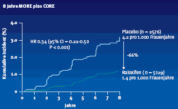 Evista® (Raloxifen) ist der am besten evaluierte SERM in der Osteoporose Therapie. Als einziges Präparat dieser Klasse ist es für die Prävention und Therapie der postmenopausalen Osteoporose zugelassen. In den grossen prospektiven Studien MORE, CORE, RUTH und STAR wurden insgesamt fast 40'000 Patientinnen eingeschlossen. Geprüft wurde die Wirksamkeit bei Patientinnen mit postmenopausaler Osteoporose, mit erhöhtem koronaren Risiko oder erhöhtem Risiko für ein Mammakarzinom. Prof. Dr. Kurt Lippuner von der Universitätspoliklinik für Osteoporose am Inselspital Bern (Schweiz) resümierte anhand dieser Studien das Nutzen/Risikoprofil von Raloxifen. Die wichtigste Studie zum Nachweis der Eignung von Raloxifen zur Fraktur-Prävention in der Post-Menopause war die Multiple Outcomes of Raloxifene Evaluation-(MORE-) Studie an 7'705 Patientinnen. Hier fand sich in der Gruppe mit vorbestehenden Frakturen unter 60 mg Raloxifen pro Tag nach 3 Jahren eine Verminderung radiologisch nachgewiesener vertebraler Frakturen um 30% im Vergleich zu Plazebo (RR 0.7). Bei Patientinnen ohne vorbestehende Frakturen fand sich eine Verminderung der vertebralen Frakturen um 50%. Eine Verminderung des Risikos neuer vertebraler Frakturen um 47% liess sich auch bei osteopenischen Frauen zeigen. Ein signifikanter Rückgang des Risikos nicht-vertebraler Frakturen liess sich in einer posthoc-Analyse der MORE-Studie nur bei Patientinnen mit vorbestehenden schweren Frakturen nachweisen. Die MORE-Studie wurde unter dem Akronym CORE (Continuing Outcomes Relevant to Evista®) für vier Jahre weitergeführt. Die vorliegenden 7-Jahres-Daten aus dem MORE-CORE-Kollektiv zeigen eine über die gesamte Studie anhaltende Verbesserung der BMD-Werte im Lumbal- und proximalen Femur- Bereich. Schon in der MORE-Studie war ein Rückgang der Häufigkeit von Mamma-Karzinomen nachweisbar (3,6/1.000 Patientenjahre unter Plazebo auf 0,9/1.000 Patientenjahre unter Raloxifen). Die Risikoreduktion betrug 76%. Nimmt man die Daten der CORE- Studie über insgesamt 8 Jahre hinzu (n=4.011), so zeigt sich eine Reduktion des Risikos für ein invasives Mamma-Ca von 66% (Abb. 4). Diese Daten sind, wie Prof. Lippuner erklärte, bislang für ein Produkt der Osteoporose Prophylaxe in der Prävention des Mamma-Ca einzigartig.