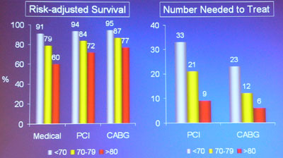 Die KHK- und Hirnschlag-Prävalenz nimmt bei Frauen und Männern mit dem Alter stark zu [5]. Während einige Risikofaktoren wie Rauchen, Übergewicht und Dyslipidämie mit steigendem Alter an Bedeutung abnehmen, kommt bei älteren Patienten eine vermehrte Komorbidität zum Tragen. Unabhängig von diesen Tatsachen profitieren die ältesten Patienten am meisten von einer invasiven Therapie [6]. Den Einfluss des Alters auf die Überlebenswahrscheinlichkeit nach einer koronaren Revaskularisation illustriert folgende Abbildung: