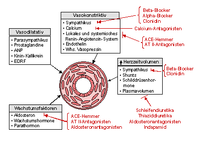 Abbildung 1: Pathophysiologie der Hypertonie und mögliche medikamentöse Angriffspunkte