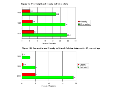 Wir wissen heute, dass die Häufigkeit des metabolischen Syndroms altersabhängig ist und dass sie mit zunehmendem Alter steigt. In einer deutschen Studie (Procam-Studie) betrug die Häufigkeit in Personen über 45 Jahren um die 25%. Bei einer zunehmend älter werdenden Gesellschaft muss deshalb damit gerechnet werden, dass die Häufigkeit des metabolischen Syndroms weiter deutlich zunimmt. In der Schweiz konnte durch den schweizerischen Gesundheitsfragebogen im Jahr 2002 eine Altersabhängigkeit des Übergewichts bei Schweizer Erwachsenen und Kindern festgestellt werden. Im Vergleich zu 1992 nahm dabei die Rate der Übergewichtigen in den letzten zwei Dekaden zu. Bereits 24% der Schweizer Schulkinder im Alter zwischen 6 und 12 Jahren leiden an Übergewicht oder Adipositas (siehe Abbildungen 1 und 2). Es wurde berechnet, dass jeder Anstieg des Körpergewichts um 5 kg innerhalb von 15 Jahren das Risiko ein metabolisches Syndrom zu entwickeln um 25% steigert. Diese Daten sind allerdings von kleinen Kohorten-Studien oder lokalisierten Fragebogen erhoben worden. Für die Schweiz liegen aktuell keine globalen Daten zur Einschätzung der Adipositas und/oder des metabolischen Syndroms vor. Dementsprechend gibt es Bemühungen in einer schweizweit epidemiologischen Kohorte die Häufigkeit dieser Symptome im Verlauf des nächsten Jahrzehntes zu verfolgen (SMS-Projekt der Cardiovasc Suisse).
