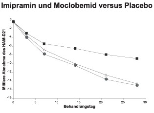 In Tabelle 1 sind die Verlaufsdaten von 506 Patienten unter Imipramin (TCA) verglichen mit den Verlaufsdaten von 580 Patienten unter Moclobemid (MAOI) und von 191 Patienten unter Placebo. Der kumulative Prozentsatz der Patienten, die bis zu einem bestimmten Zeitpunkt eine Besserung bzw. einen Therapieerfolg gezeigt hatten, war unter allen drei Therapieformen und zu jedem Zeitpunkt der Studie nahezu identisch. Die Besserung (=Wirkungseintritt) wurde in 70% der Patienten innerhalb der ersten beiden Behandlungswochen beobachtet, und zwar unabhängig von der Behandlungsart. Eine frühe Besserung ist der einzig bekannte Prädiktor für den späteren Therapieerfolg bei einer Sensitivität und Spezifität von > 70%.