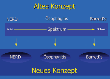Heutzutage wird vielmehr von drei grösstenteils isolierten Untergruppen der Refluxkrankheit ausgegangen. Dabei leidet die weitaus grösste Zahl der Patienten an einer sog. «Nicht-Erosiven Refluxkrankheit» (= NERD), eine kleinere Gruppe an einer Refluxösophagitis und eine dritte Gruppe an Barrett’s Ösophagus. Die Mehrheit der Patienten mit NERD oder Refluxösophagitis reagieren demnach immer stereotyp und verändern ihre Expressionsform nicht, ungeachtet des Schweregrades ihres Reflux. Umstritten ist dieses Konzept noch beim Barrett’s Ösophagus. Möglicherweise sind hier die Veränderungen doch Komplikationen, die aus den ersten beiden Gruppen hervorgingen.