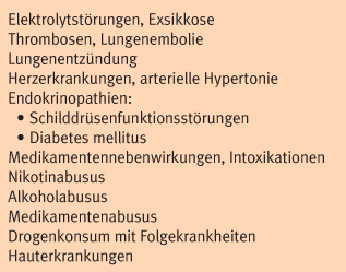 Trotz immenser technokratischer Einflüsse auf das Medizinalgeschehen, ist in der Inneren Medizin der Merksatz «Die Anamnese ist die halbe Diagnose» unverändert gültig. In der Psychiatrie erlangen – oft mehrzeitige – Fremdanamnesen häufig ganz spezielle Bedeutung und der Aufwand lohnt sich immer! In folgender Tabelle sind einige der wichtigsten internistischen Störungen oder Komplikationen aufgeführt: