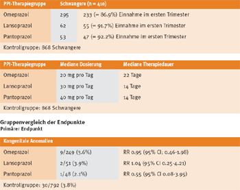 Schwangerschaftsverlauf und Gestationsalter unterschieden sich in keiner der PPI-Gruppen. Das Geburtsgewicht der Neugeborenen war in der Omeprazolgruppe im median 60 gr. leichter als in der Kontrollgruppe (3’280 vs. 3’340 gr.).