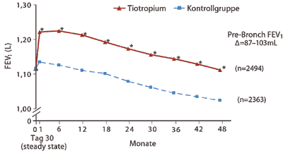In der Tiotropiumgruppe zeigte sich gegenüber der Kontrollgruppe trotz intensiver Begleitmedikation (unter anderem mit langwirksamen Betaagonisten und inhalierbaren Steroiden) eine signifikant bessere Lungenfunktion, und zwar konstant über 4 Jahre (keine Toleranzbildung). Die Progression der FEV1-Abnahme konnte jedoch nicht verzögert werden.