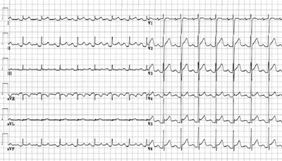 Bisher war keine arterielle Hypertonie und keine andere kardiovaskuläre Risikofaktoren bekannt. Vor 4 Jahren hatte er eine schwere ulzerierende Ösophagitis. Die klinischen Befunde sind bis auf den erhöhten Blutdruck unauffällig. Sie schreiben als erstes ein EKG.