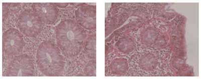 Der kluge Gastroenterologe hatte trotzdem eine Verdachtsdiagnose und entnahm mehrere Schleimhautbiopsien, wovon sie ein histologisches Präparat (rechts) finden. Daneben ein Stück normale Darmschleimhaut zum Vergleich (links).