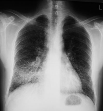 Dyspnoe verspürt er lediglich bei starker Anstrengung. Fieber wird verneint. Lungenperkussion und -auskultation sind unauffällig; im Gegensatz zum Röntgenbild: