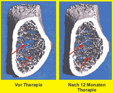 - Zuwachs der Knochensubstanz (BMD nach DXA): 2,7% im Bereich der lumbalen Wirbelkörper, 2,4% am proximalen Femur,
